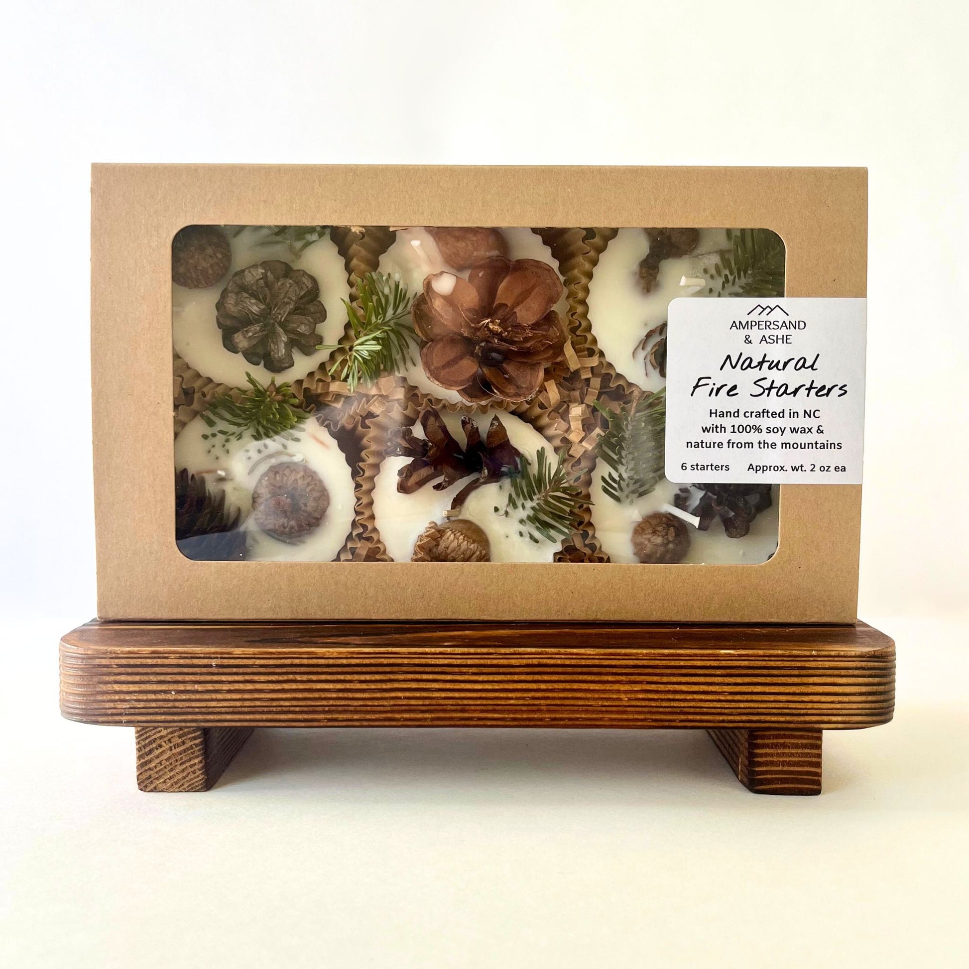 These natural fire starters are made with 100% soy wax and nature gathered from the mountains of North Carolina and New York. Pinecones and acorns are soaked in a solution of water and vinegar then oven dried to ensure no uninvited guests are included with purchase.