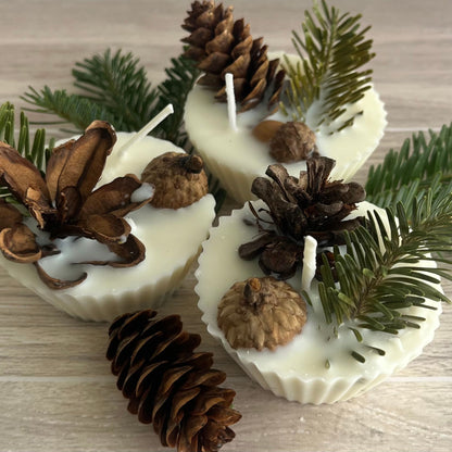 Each individual fire starter will be unique but contain shredded paper towels recycled from cleaning wax melt pots, 100% soy wax, cotton wick, along with a variation of pine cones, acorns and pine needles. A small amount of non toxic fragrance oil is added to the wax for a subtle pine scent.