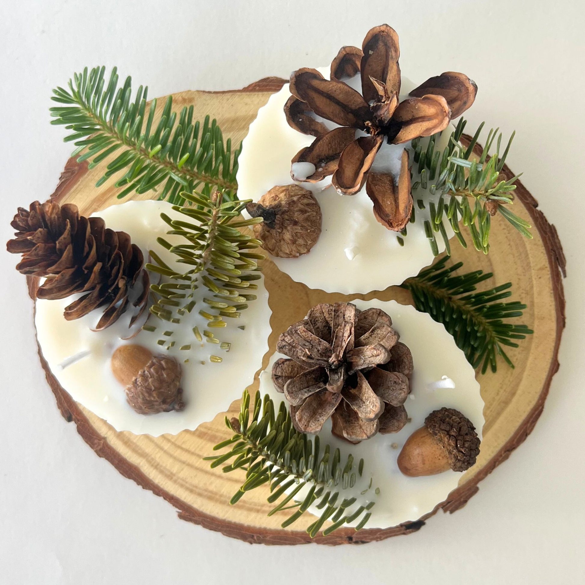 Each individual fire starter will be unique but contain shredded paper towels recycled from cleaning wax melt pots, 100% soy wax, cotton wick, along with a variation of pine cones, acorns and pine needles. A small amount of non toxic fragrance oil is added to the wax for a subtle pine scent.